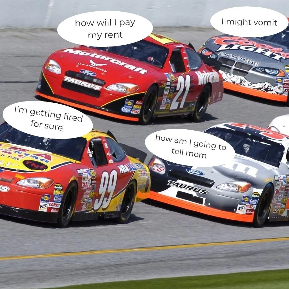 If you’ve ever watched a car race, or even a scene from an action movie, you’ve probably witnessed a “burnout”. This is when the driver stomps on the gas from a complete stop, causing the tires to spin, squeel, smoke, and burn. This is not good for the car, the tipres, and certainly not good when we do it to ourselves. Racing thoughts associated with anxiety can cause their own sort of burnout — panic attacks, spinning minds, and burning up of energy stores.